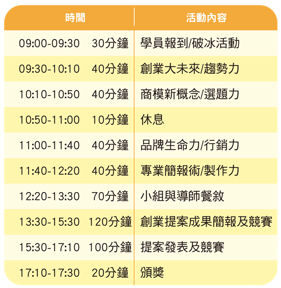 4大新創趨勢課程 :創業大未來/趨勢力、商模新概念/選題力、品牌生命力/行銷力、專業簡報術/製作力