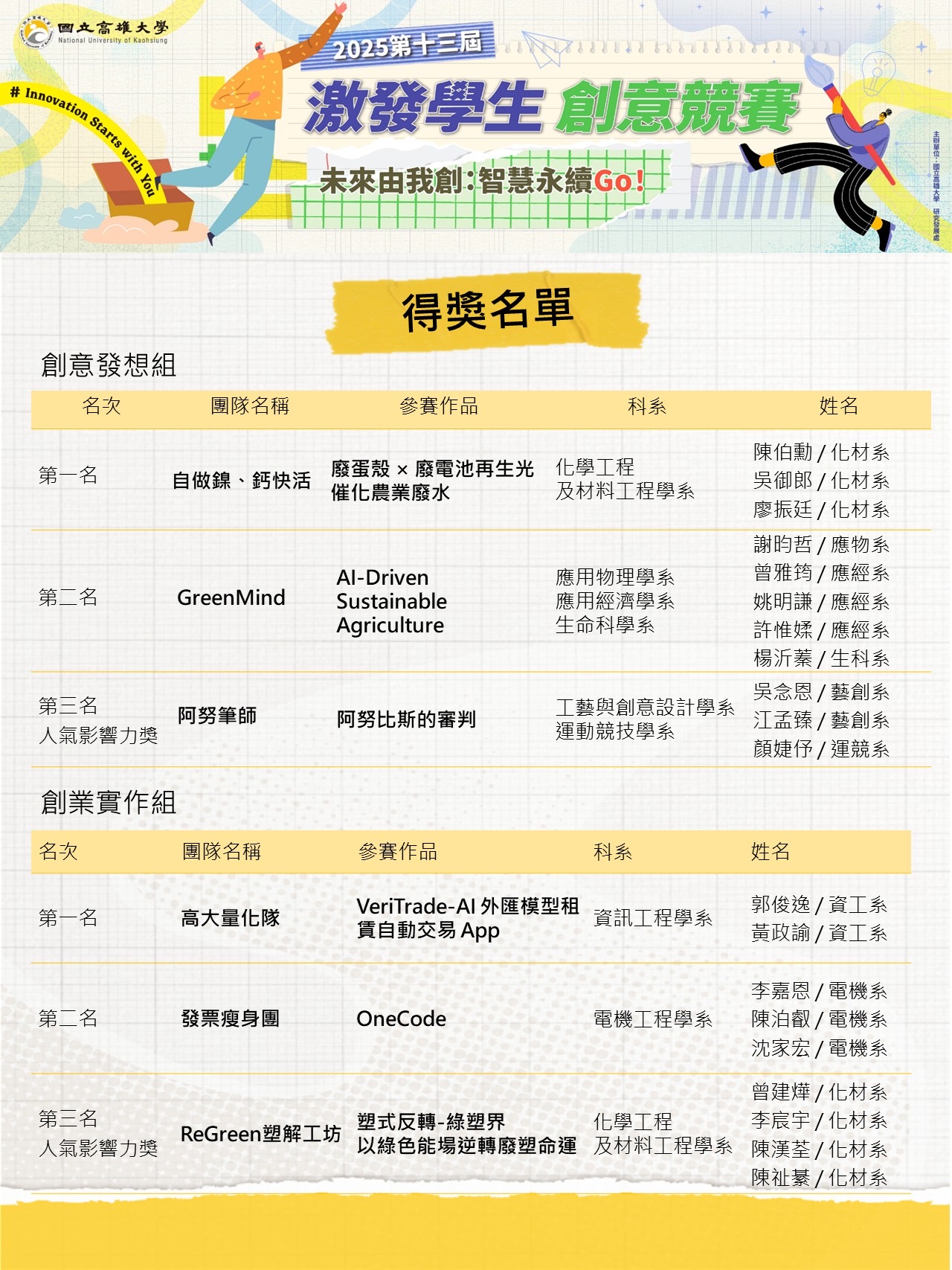 感謝各位同學踴躍參與本次激發學生創意競賽,再次恭喜得獎團隊,我們明年再見囉!