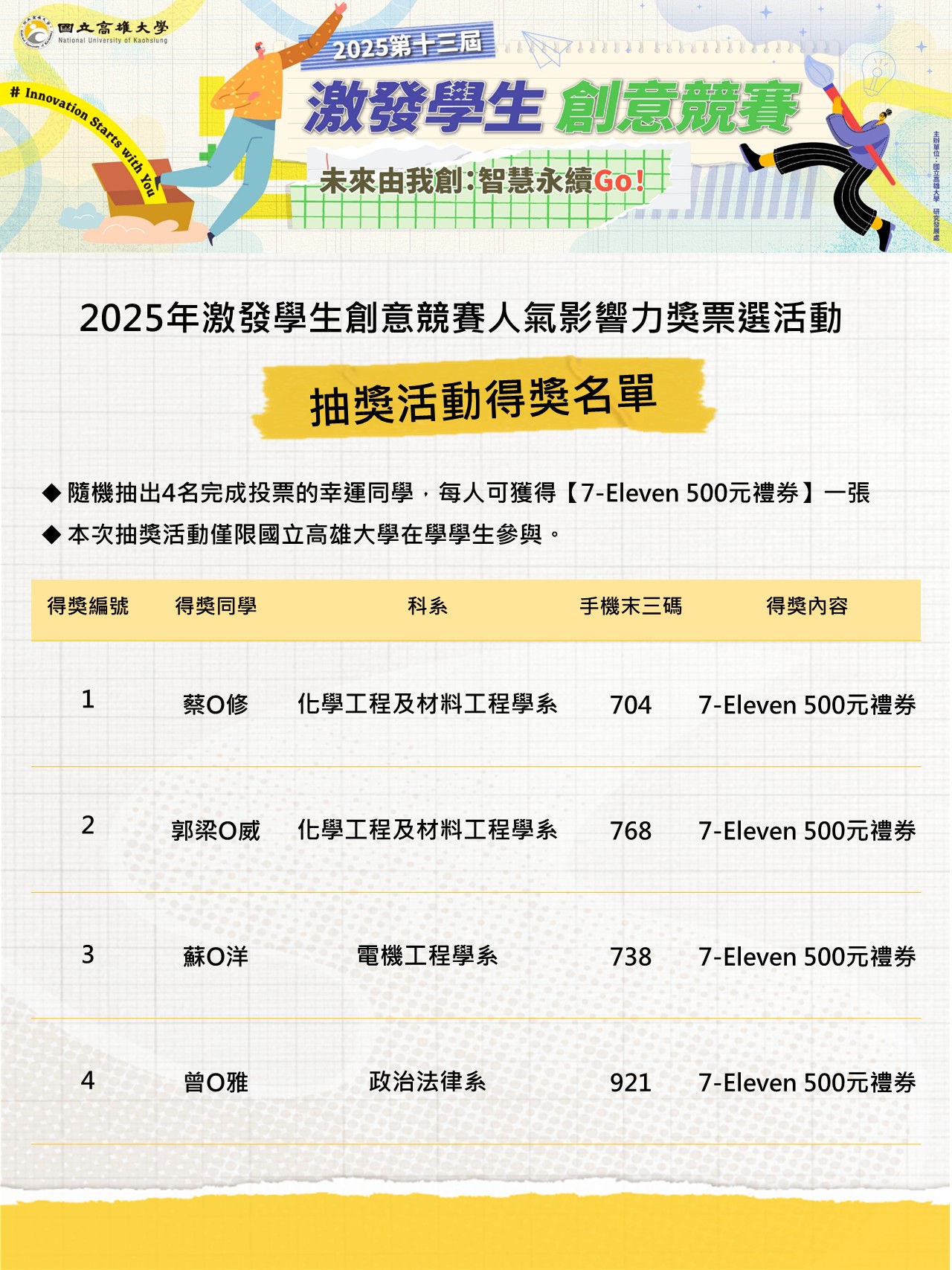本次活動已成功票選出同學心中最具人氣的團隊,並產生本次抽獎活動的中獎名單囉!